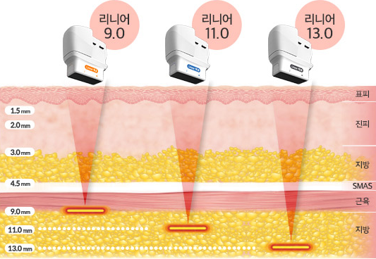 3 种类型的墨盒将能量精准地传送到各个皮肤层(真皮上层、真皮、筋膜 SMAS 层),形成凝固区并诱导胶原蛋白的产生。这可以减少面部皱纹并达到整体紧致皮肤的效果。
